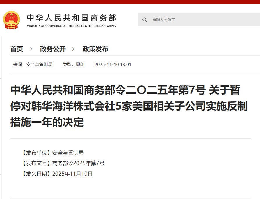 圖源:中國商務部網站截圖 此前在美東時間10月14日,美國開始實施對中國海事、物流和造船領域301調查的最終措施。 中國商務部10月14日指,美國對中國海事、物流和造船業開展301調查並採取措施,嚴重違反國際法和國際關係基本準則,嚴重損害中國企業合法權益。韓華海洋株式會社在美相關子公司協助、支持美國政府相關調查活動,危害中國主權、安全、發展利益。中國當日起對韓華海洋株式會社5家美國相關子公司採取反制措施:禁止中國境內的組織、個人與其進行有關交易、合作等活動。 韓華海洋株式會社是韓國造船巨頭企業。 美東時間11月9日,美國宣布自11月10日起暫停實施其對中國海事、物流和造船業301調查措施一年。 301調查是美國依據“301條款”(美國《1974年貿易法》第301條的俗稱)進行的調查。“301條款”是美國貿易法中有關對外國立法或行政上違反協定、損害美國利益的行為採取單邊行動的立法授權條款。該條款授權美國貿易代表可對他國的“不合理或不公正貿易做法”發起調查,並可在調查結束後建議美國總統實施單邊制裁。(完) 【編輯:彭玉婷】
