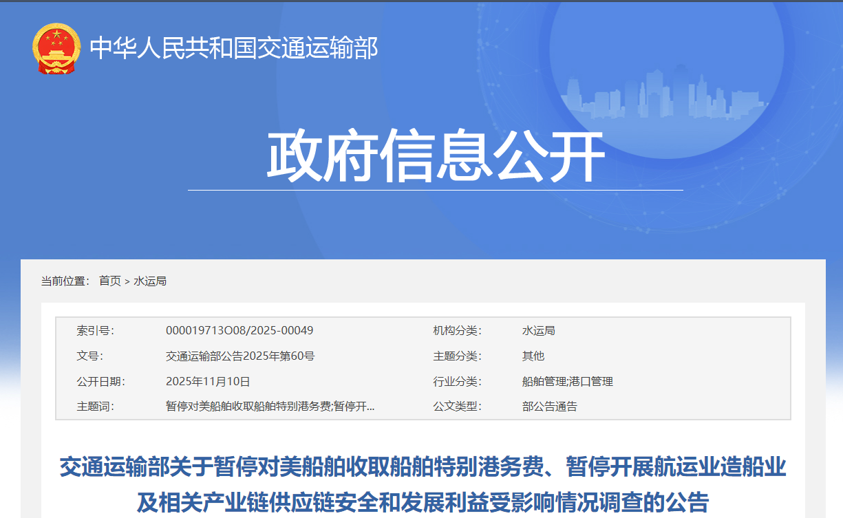 圖源:中國交通運輸部網站 《公告》稱,為落實2025年中美吉隆坡經貿磋商達成共識,經國務院批准,自2025年11月10日13時01分起,與美方暫停實施對華海事、物流和造船業301調查最終措施同步暫停實施《交通運輸部關於對美船舶收取船舶特別港務費的公告》(交通運輸部公告2025年第54號)、《交通運輸部辦公廳關於印發<對美船舶收取船舶特別港務費實施辦法>的通知》(交辦水〔2025〕59號)、《交通運輸部關於啟動航運業、造船業及相關產業鏈供應鏈安全和發展利益受影響情況調查的公告》(交通運輸部公告2025年第55號)1年。(完) 【編輯:彭玉婷】