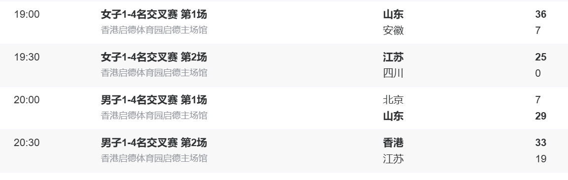 香港隊以33比19戰勝江蘇隊,山東隊以29比7戰勝北京隊。