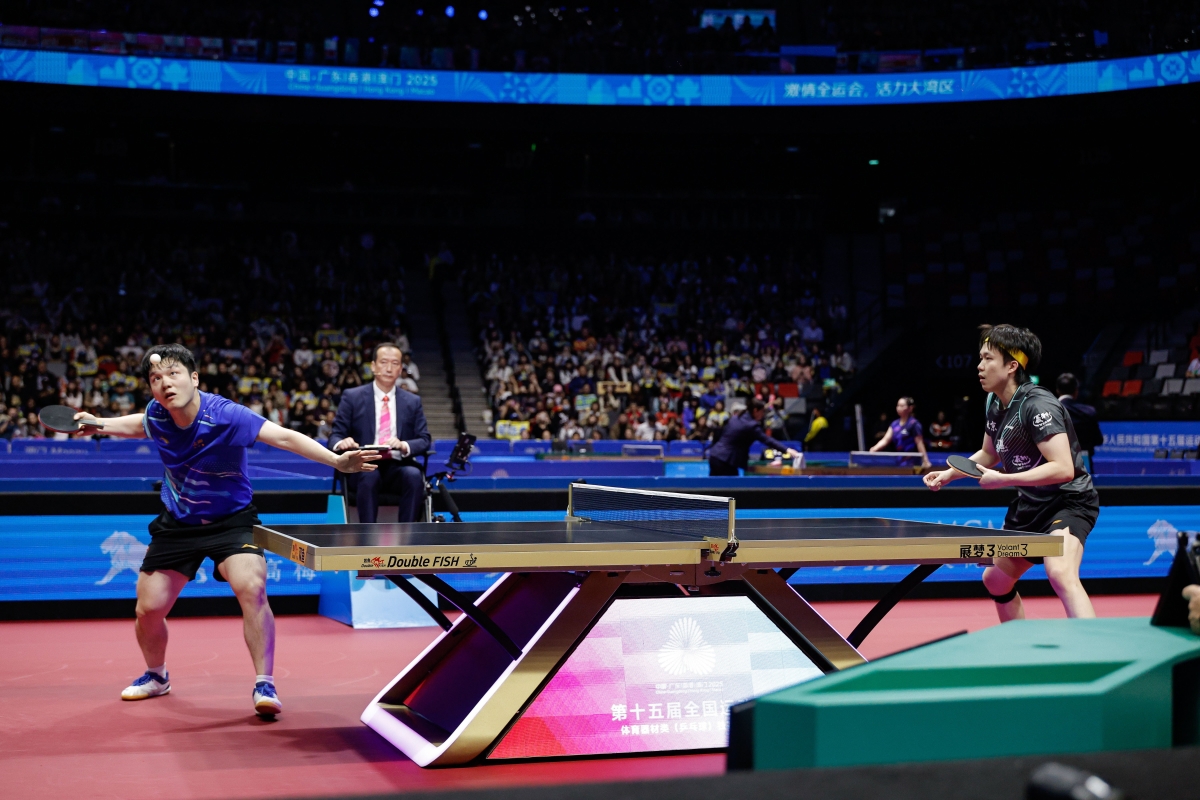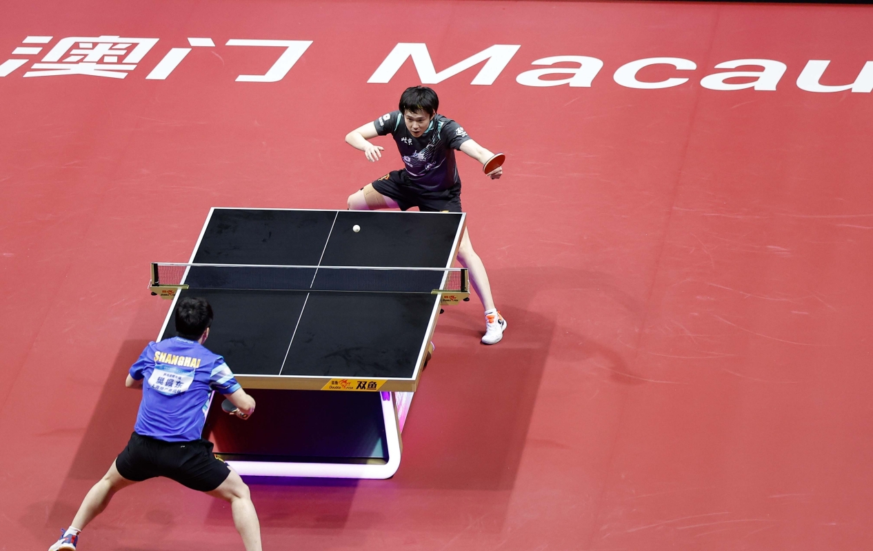 香港新聞網11月15日澳門電 第十五屆全國運動會乒乓球男子單打半決賽11月15日在銀河綜藝館展開賽。上海樊振東以4比2戰勝北京王楚欽晉級決賽。