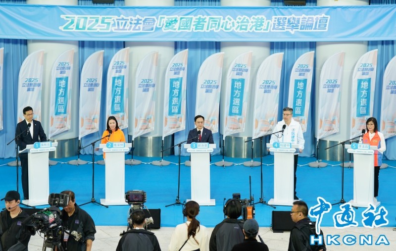 香港中通社11月15日電(香港中通社記者陳卓儀)香港第八屆立法會選舉將在12月7日投票,特區政府主辦39場“愛國者同心治港”選舉論壇,15日分別舉辦港島西、港島東兩個地方選區的選舉論壇。多名候選人提出要為中產群體爭取權益,現場辯論愛國教育、AI發展、海濱旅遊、少數族裔融合等議題。 港島西、港島東分別各有5位候選人,將各產生兩名立法會議員。 早上舉行的是港島西選區論壇,候選人包括自由黨的楊哲安、新民黨的陳家珮、報稱無政黨背景的黃秋萍、民建聯的陳學鋒,以及工聯會的郭偉强。 當天論壇在香港公園奧林匹克廣場舉辦,市民圍坐在室外圓形階梯上,氣氛熱烈。現場打氣團各出奇招。有些不斷重複候選人號碼、名字、高喊“當選”,有些將政綱一一念出,有些以押韻方式,將候選人的英文名融入號碼。