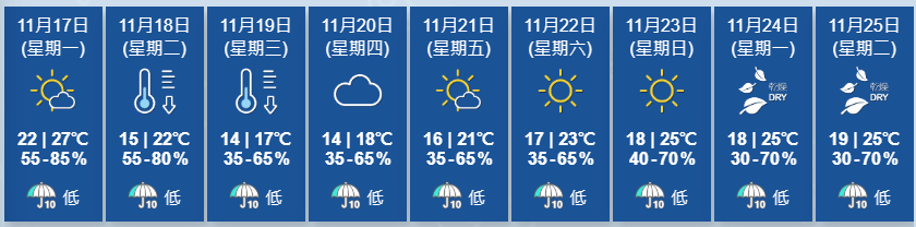 香港本周天氣情況。(圖源:香港天文台) 展望本周天氣,天文台強調,冷鋒過境後,香港明日(11月18日)將顯著轉涼,風勢頗大。星期三(11月19日)市區氣溫進一步下降至14度左右,新界部分地區如北部高地可能出現寒冷天氣,市民需注意保暖。本周後期(周四至周日),天色逐漸好轉,日間非常乾燥,氣溫逐步回升,但早上仍清涼,市區低溫可能徘徊在16至18度。 市民應及早準備 香港天文台提醒,本次寒潮影響與全國天氣系統緊密相連,公眾需密切關注最新預報。建議市民防寒保暖:明日氣溫驟降,長者、兒童及慢性病患者宜添衣保暖。 本次天氣變化源於北方強冷空氣南下,預計影響將持續至周末。天文台將實時更新預警,市民可透過官方網站或手機應用獲取最新信息。隨著全球氣候變暖,極端天氣頻發,此類寒潮事件提醒市民加強防災意識,確保健康安全。 (完) 【編輯:錢林霞】