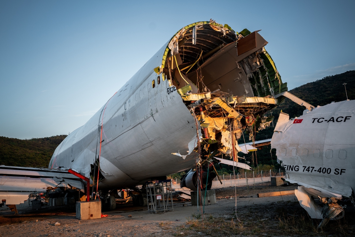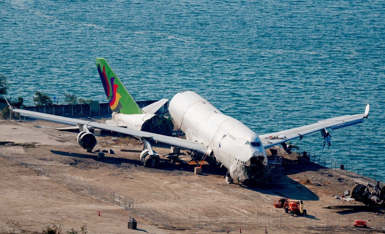 機頭遭受嚴重破壞,原本圓滑的機鼻已消失,內部的線路、管道與支撐結構清晰可見。 民航意外調查機構已取回“黑匣子”并正進行深入調查,初步調查報告預計在一個月內(即2025年11月下旬前)發表。目前尚未有最終調查結果公佈。10月20日,一架由阿聯酋阿勒馬克圖姆國際機場抵港的波音744貨機(航班編號UAE9788)凌晨在香港國際機場北跑道降落後偏離跑道,滑出海面。貨機上的4名機組人員獲救送院。事故中有一輛地勤巡邏車被撞入海,導致車上兩名地面工作人員死亡。香港的民航意外調查機構(AAIA)主導調查。根據國際民用航空公約,美國國家運輸安全委員會(NTSB)等相關國家/地區代表及波音專家也參與其中。據悉,調查人員已成功從殘骸中取出“黑匣子”(飛行數據記錄器和駕駛艙語音記錄器),并送往進行數據處理及分析。地政總署利用專業設備協助記錄現場數據。