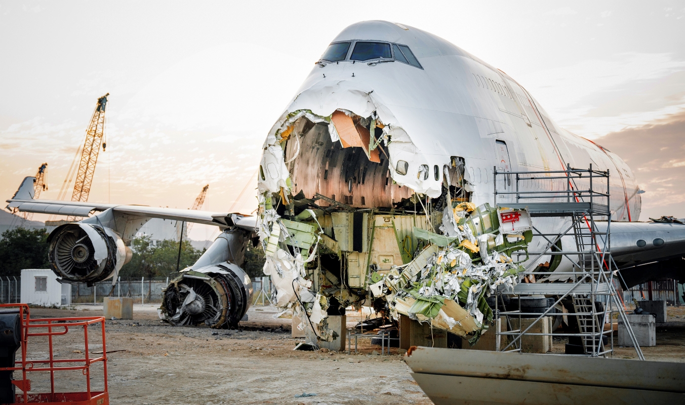 其機身與幾尾斷裂處金屬切口呈現不規則的撕裂狀,機尾緊隨其後側臥在地面,鮮綠底色配上紅紫色花瓣狀塗裝,在一片廢墟中格外突出。