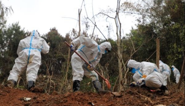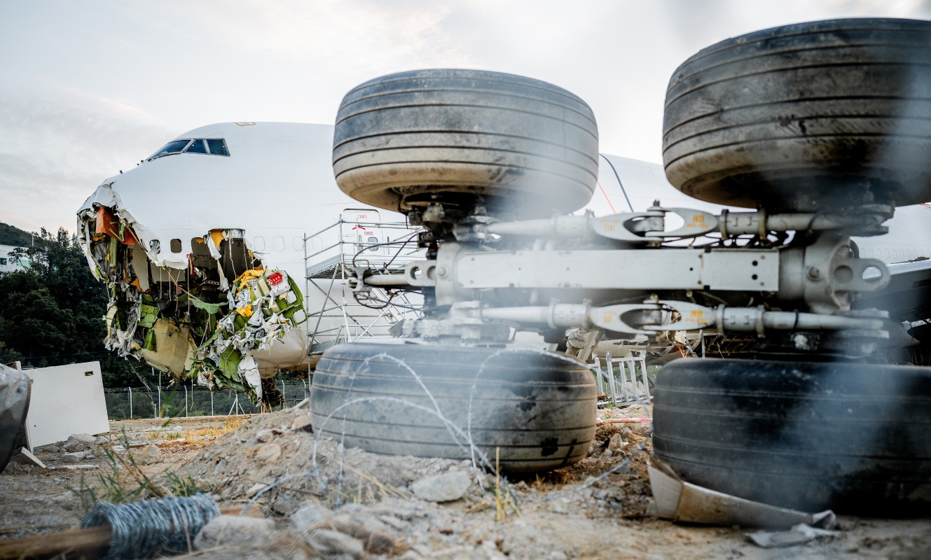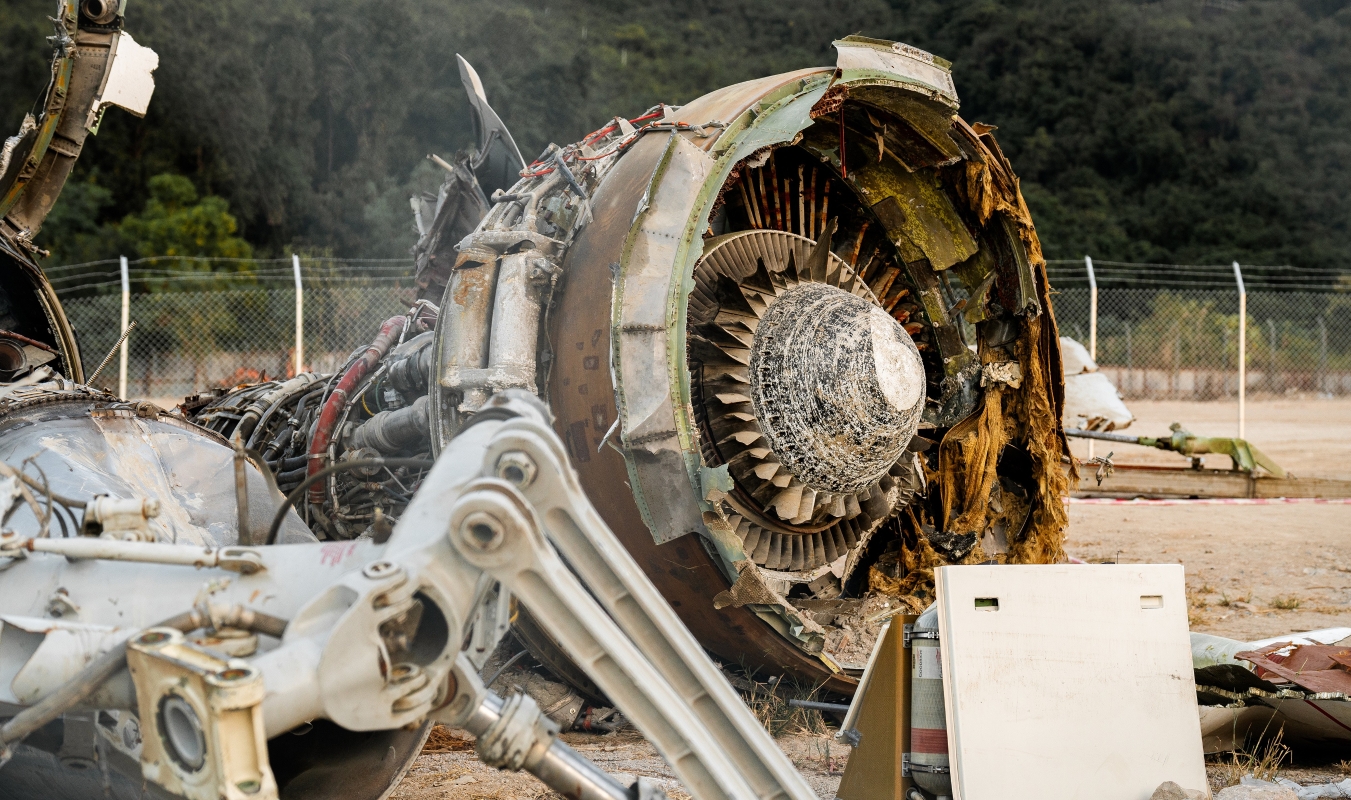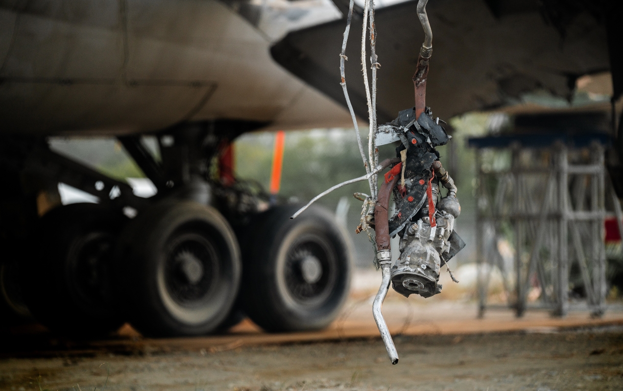 另一側的地面散落著多件引擎部件,部分風扇葉片脫落,起落架輪胎被移到一旁,輪圈覆滿泥塵。