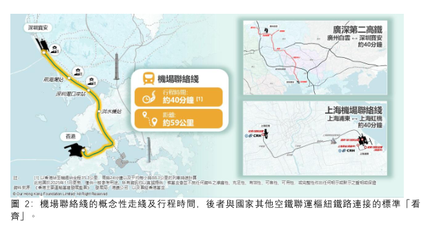 報告指出,與新加坡、首爾、廣州及深圳等區內航空樞紐相比,香港機場的客量優勢早在疫情前已開始收窄,並在疫情後遭到反超(圖 1)。因此“按兵不動”,寄望單靠三跑道系統(三跑)帶來的跑道容量維持優勢並不可取。在廣深第二高鐵落成後,三跑或無法充分發揮其運力潛力,難以說服公眾此重大投資物盡其用,削弱香港在區域格局中的地位。 令人擔憂的是,香港大部分市民和相關持份者對國家空鐵聯運規劃,以及區内航空交通競爭格局並未充分了解。若香港仍然安於現狀,而未積極融入大灣區空鐵聯運“朋友圈”,將面臨逐步被邊緣化的風險,令原本的國際航空樞紐逐漸淪為被區內交通及商務主流排除在外的孤島。 報告建議延長即將上馬、並預計於 2035 年通車的港深西部鐵路,從規劃中的深圳前海終點站延伸至深圳寶安機場,並將其香港終點站由洪水橋延伸至香港機場。報告強調,關鍵在於延伸段需同步推進,力爭於 2035 年投入運作,從而盡量縮短與廣深第二高鐵通車的時間差,避免香港在區域連通性方面再“慢半拍”。 機場聯絡綫經深圳寶安機場把香港機場連接國家高鐵網絡,將港深機場之間的行程壓縮至約40分鐘,與同樣連接機場樞紐的上海市域機場綫及未來廣深第二高鐵“看齊”,成為港深機場之間一條穩定、可預期、全天候運作的專屬通道(圖 2)。