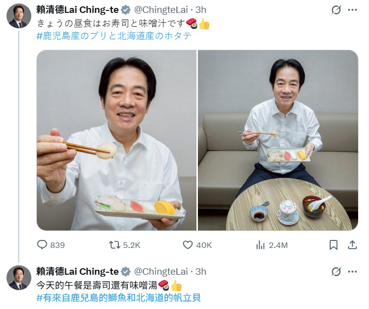 一貫“媚日”的賴清德與民進黨,見到日本遭遇中國反制,紛紛坐不住欲表態“力挺日本”。在連續附和高市早苗謬論後,賴清德20日曬出日本料理午餐,大批綠營政客“拿香跟拜”,也在社交媒體宣稱要大啖日本海鮮,以支持日本。