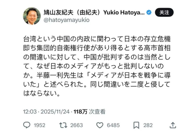 日本前首相鳩山由紀夫社媒截圖。 鳩山由紀夫還指出,為什麼日本媒體沒有進行更多的批判?(已故日本歷史學者)半藤一利先生曾說過“媒體把日本帶向了戰爭”,同樣的錯誤,絕不能再犯。 據此前報道,11月7日,高市在日本國會答辯時稱,“台灣有事”或構成日本可行使集體自衛權的“存亡危機事態”。此番言論隨即引發法律學者、反戰組織及在野黨的強烈批評。日本輿論指出,高市的言論違背了日本政府在1972年日中聯合聲明中所作承諾,與日本長期對華外交方針存在明顯矛盾,勢必引發地區局勢不必要的緊張。(完) 【編輯:豐悅】