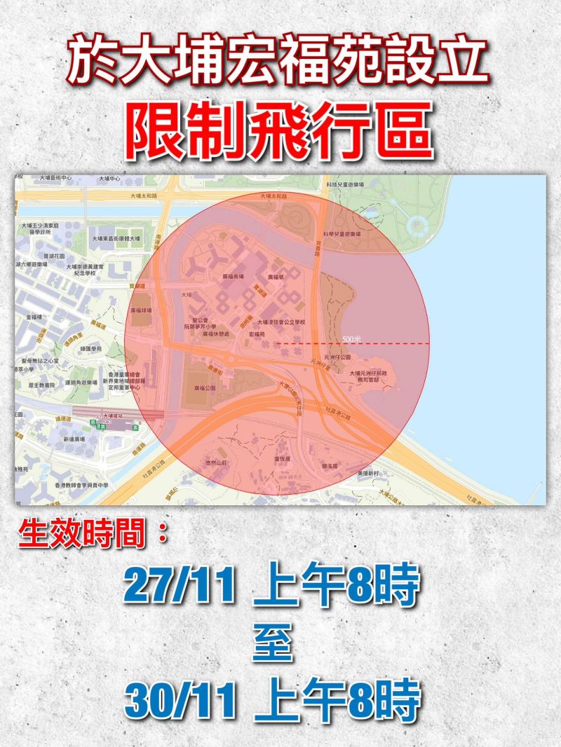 香港新聞網11月27日電 香港警方今日(11月27日)在社交平台發文表示,就大埔宏福苑發生的五級火警,為保障公眾安全及確保救援工作進行,警務處將於該範圍設立“限制飛行區”。時間為2025年11月27日上午8時至2025年11月30日上午8時。