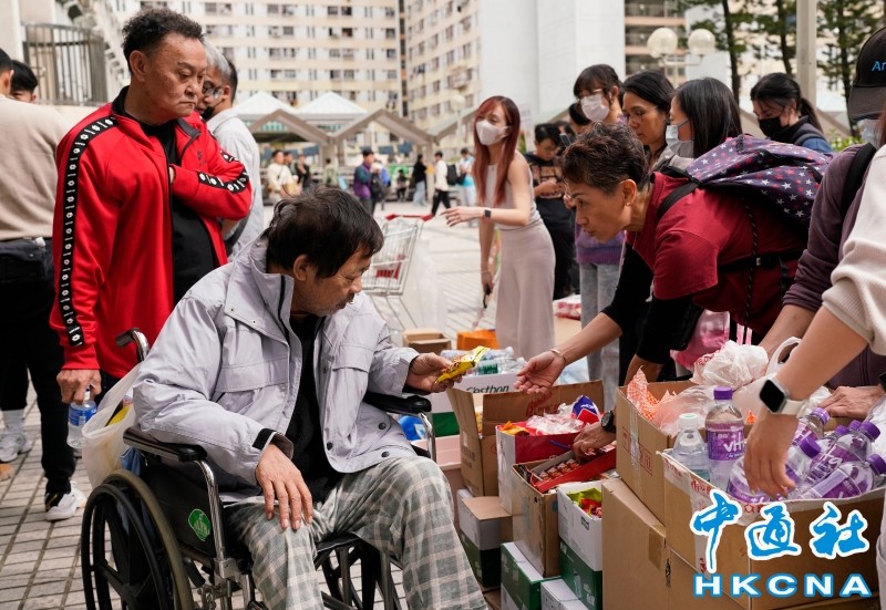 香港中通社圖片 火警發生後政府開設了8個臨時庇護中心,撤離的災民很快得到暫時安置。一夜過去,在中華基督教會馮梁結紀念中學的院子,堆滿了衣服、瓶裝水等物資。一家便利店老闆驅車30公里送來一箱水果並笑說“我知道不缺物資,但想著天氣乾可以多吃水果。” 濃煙嗆鼻,讀中學的王同學與幾個同學自發向途人和消防員派發口罩、能量飲料,表示一整晚都在關注火勢,放學就立馬到大埔看有什麼能幫忙。 宏福苑附近的公園、天橋站滿關注火場的居民,附近的商場成為臨時的民間物資流轉處。有社區中心騰出床位,也有市民駕車並貼上“免費接載”的牌子。