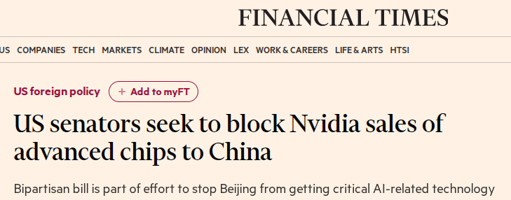 《金融時報》報道截圖 據英國《金融時報》日前報道,美國參議院外交關係委員會東亞小組共和黨主席皮特·里基茨與首席民主黨參議員克里斯·庫恩斯於4日聯合發起《安全可行芯片出口法案》。該法案要求美國商務部長在30個月內拒絕向中國發放先進芯片的出口許可證,這意味著英偉達向中國銷售其最先進的H200及Blackwell芯片將受到法律阻截。 庫恩斯強調:“21世紀餘下的命運將取決於誰贏得人工智能競賽。”他指出,這項技術是建立在美式還是中式價值觀之上至關重要。里基茨則表示,隨著美國芯片企業持續創新,并將對華AI芯片出口限制寫入法律,“我們將成倍擴大計算優勢”,因此“阻止中國獲取這些芯片十分關鍵”。 報道分析稱,該法案提出之際,美國對華強硬派擔心特朗普為維持其在10月與中國達成的貿易協議而忽視安全問題,并對中國可能獲得英偉達H200芯片表示憂慮。前白宮及商務部官員賽義夫·汗指出:“若不受限制地使用H200,中國將能够建造前沿規模的AI超級計算機,從而開發出最強大的AI系統。” 在與特朗普會面前,黃仁勛曾公開表示,中國不會接受性能被削減的芯片,美國企業應被允許向中國出口最具競爭力的產品。但這一立場隨後遭到共和黨參議員約翰·肯尼迪的反駁,他直言黃仁勛“并非美國應對華出口何種技術的可靠信息來源”。肯尼迪進一步表示:“如果我要就向中國提供技術尋求客觀建議,他絕非合適人選。” 這反映出美國國內在對華芯片出口問題上存在的兩種不同態度。 一方主張向中國出口先進芯片,使其形成對美技術依賴,如美國商務部長盧特尼克7月受訪時所言,要讓中國開發者對美國技術“上癮”。 另一方則主張全面禁止對華芯片銷售,特朗普前戰略顧問史蒂夫·班農即持此觀點,他擔憂再度出現類似DeepSeek的“斯普特尼克時刻”,甚至建議應像冷戰時期管控核技術那樣,禁止中國學生赴美學習AI。