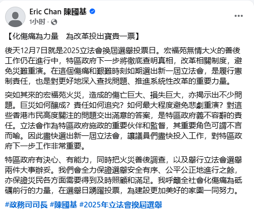 香港新聞網12月5日電 12月7日是香港立法會換屆選舉投票日,宏福苑無情大火的善後工作仍在進行中。香港特區政府政務司司長陳國基5日在社交平台發文指,特區政府下一步將徹底查明真相,改革相關制度,避免災難重演。在這個傷痛和艱難時刻如期選出新一屆立法會,是履行憲制責任,也是對更好地深入查找問題、推進系統性改革的重要力量。
