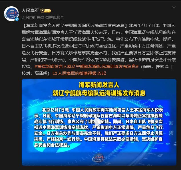 圖源:“人民海軍”微博賬號截圖 王學猛海軍大校指,日方有關炒作與事實完全不符,我們嚴正要求日方立即停止污蔑抹黑,嚴格約束一線行動。中國海軍將依法採取必要措施,堅決維護自身安全和合法權益。 日媒報道,日本防衛大臣小泉進次郎7日凌晨舉行記者會稱,6日在沖繩島東南方向的公海上空,中國海軍遼寧艦上起飛的殲-15戰機向日本自衛隊F-15戰機進行雷達照射。(完) 【編輯:彭玉婷】