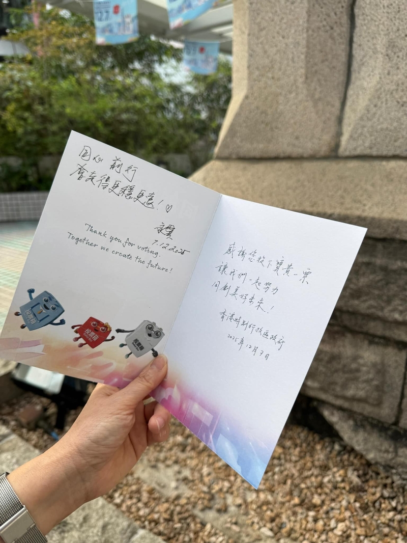 圖源:何永賢fb 房屋局局長何永賢投票後在社交網頁表示,副局長戴尚誠及團隊等踴躍投票,並在各自心意卡上寫出對香港的心聲,表達政府團隊希望與立法會帶領整個社會前行。
