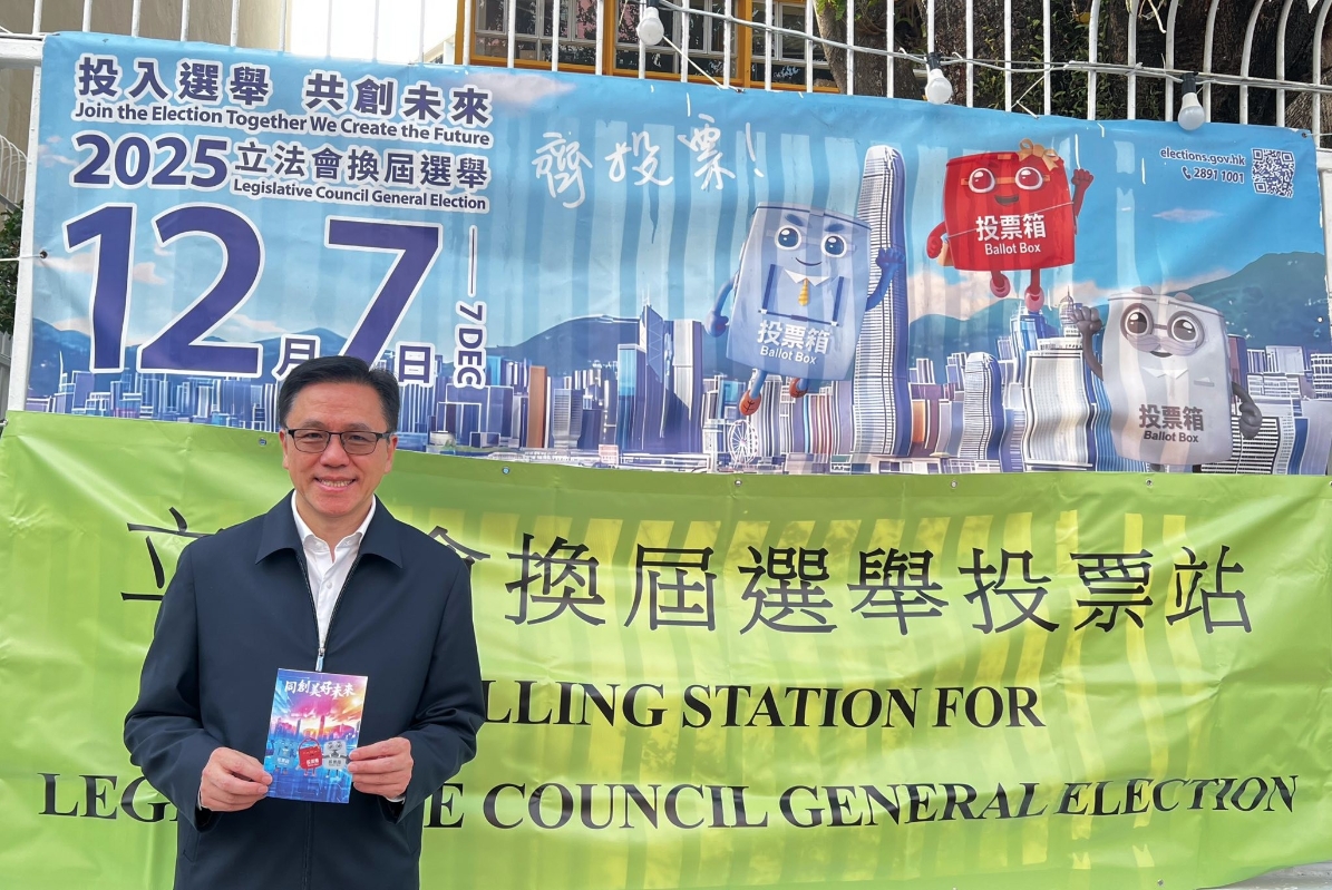 圖源:曾國衛fb。 政制及內地事務局局長曾國衞早上到灣仔會展的選委會界別票站巡視,之後前往東區少年警訊會所投票站投票。他形容立法會選舉對香港,對行穩致遠、一國兩制,以至良政善治、由治及興,甚至對大埔火災善後工作亦非常重要,呼籲踴躍投票。