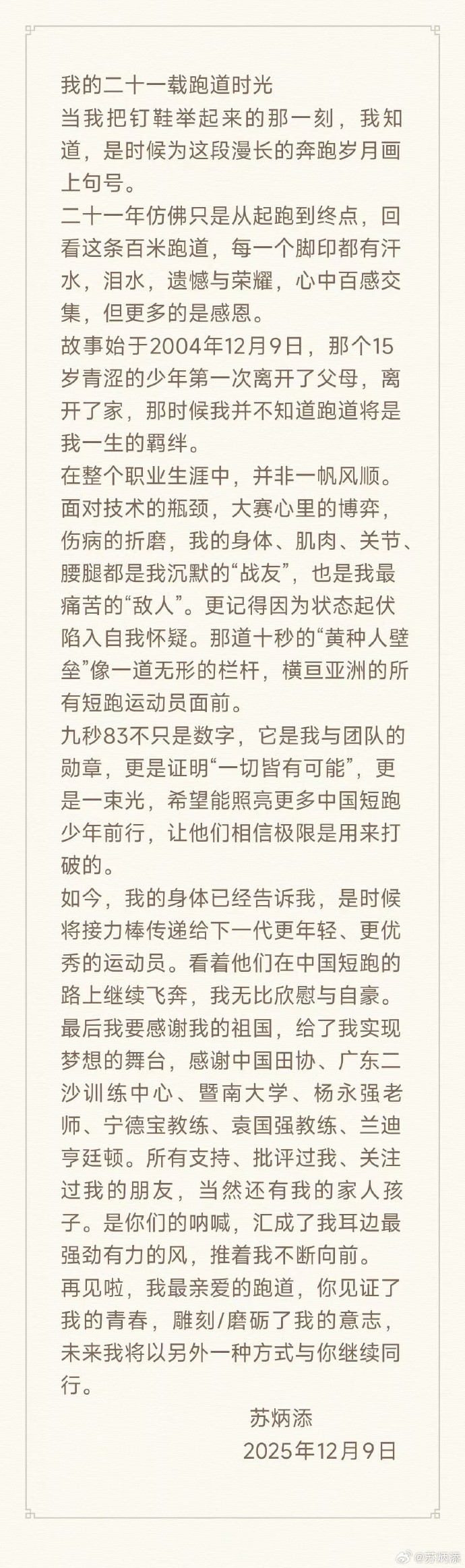 資料圖為蘇炳添。圖片來源:新華社 蘇炳添今年36歲,廣東中山人,他是男子60米、100米亞洲紀錄保持者。他9日上午在社交平台上發文宣布退役。 蘇炳添稱,如今身體已經告訴他,是時候將接力棒傳遞給下一代更年輕、更優秀的運動員。“再見啦,我最親愛的跑道,你見證了我的青春,雕刻/磨礪了我的意志,未來我將以另外一種方式與你繼續同行。” 他表示,在整個職業生涯中,並非一帆風順,“面對技術的瓶頸,大賽心裡的博弈傷病的折磨,我的身體、肌肉、關節、腰腿都是我沉默的‘戰友’,也是我最痛苦的‘敵人’。更記得因為狀態起伏陷入自我懷疑。那道十秒的‘黃種人壁壘’像一道無形的欄桿,橫亙亞洲的所有短跑運動員面前”。