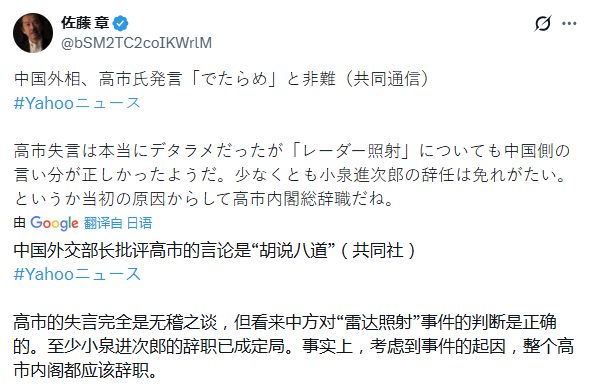 日本前防衛副大臣島田和久(日本《產經新聞》報道截圖) 日本前航空自衛隊司令、退役中將永岩俊道則妄稱,中方間歇性雷達照射 “意在恐嚇”,違背了國際水域執行任務的戰鬥機飛行員應有的專業精神,還稱中國應該為此行為受到嚴厲抗議。 然而,日方的種種辯解無法掩蓋其滋擾中方軍事訓練的事實。在10日的中國外交部例行記者會上,發言人郭嘉昆明確指出,中方已多次闡明嚴正立場,事件真相十分清楚。日方此前聲稱沒有接到中方通報,現在又承認事先收到了中方的信息,前後矛盾,顧左右而言他。日方還拒不解釋,在事先收到通報的情況下,為何執意派戰鬥機擅自闖入中方演訓區域,抵近偵察滋擾,製造緊張事態,持續惡意炒作,日方是不是在故意轉移焦點,企圖誤導國際社會? 日方將中方合理合法的軍事訓練操作包裝成 “被照射” 事件,顛倒黑白將自己偽裝成受害者以製造輿論聲浪的行徑,遭到多方譴責。 日本時政評論員佐藤章就直言這是“國家恥辱”。他在社交平台X發帖指出,關於“雷達照射”事件,看來中方的描述才是正確的。“日方如今無論再如何辯解都不會取信於人”。他還認為,至少小泉進次郎的辭職“已成定局”,并稱整個高市內閣都“必須辭職”。