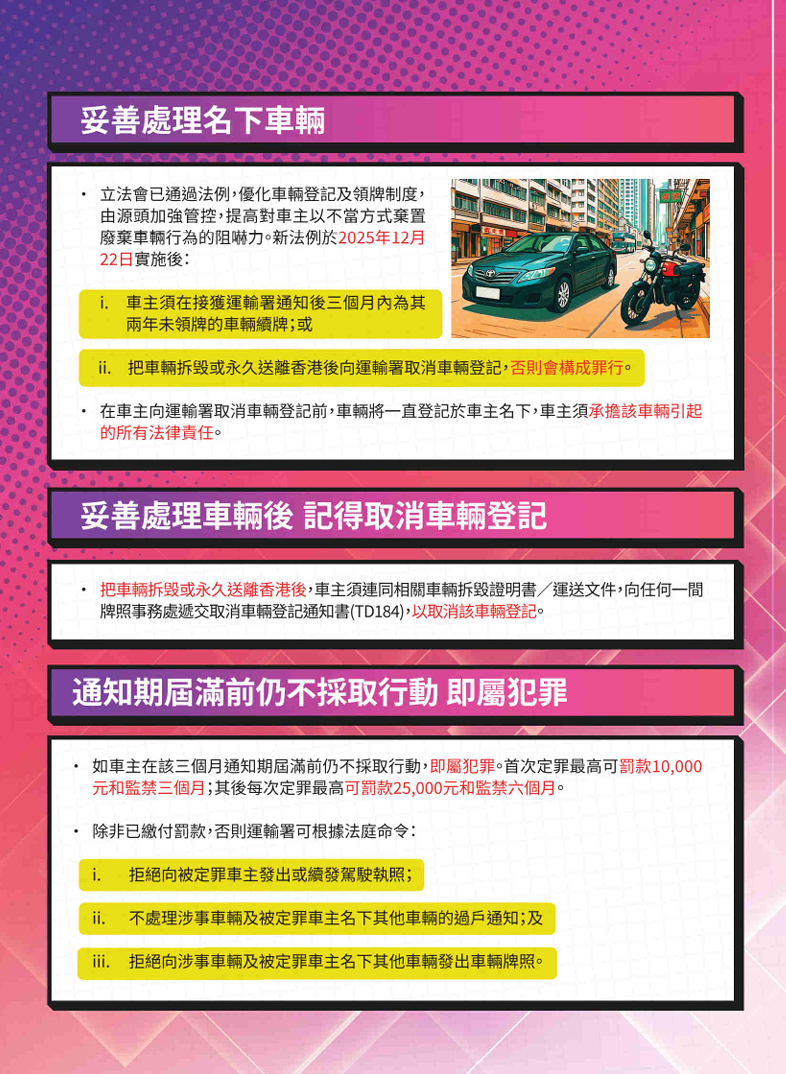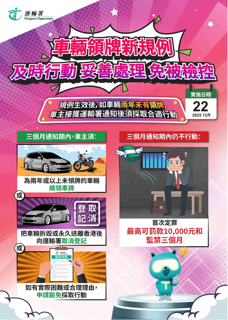香港新聞網12月14日電 香港運輸署今日宣布,車輛登記及領牌新制度將於12月22日實施,旨在加強規管長期未領牌的車輛,從源頭解決不當棄置車輛的問題。在新制度下,未領牌車輛將一直登記在車主名下,車主須為其車輛負上責任。 運輸署發言人說:“由十二月二十二日起,署方將向兩年或以上未領牌車輛的登記車主發出通知書,要求車主必須在發出通知書日期的三個月內為車輛領牌,或把車輛拆毀或永久送離香港後,將相關證明文件提交運輸署,並取消登記。車主須及時妥善處理車輛,以免觸犯法例。” 如車主在該三個月通知期屆滿前仍不作適當跟進,即屬犯罪。首次定罪最高可罰款10,000元和監禁三個月;其後每次定罪最高可罰款25,000元和監禁六個月。除非已繳付罰款,否則運輸署可根據法庭命令:(一)拒絕向被定罪車主發出或續發駕駛執照;(二)不處理涉事車輛及被定罪車主名下其他車輛的過戶通知;及(三)拒絕向涉事車輛及被定罪車主名下其他車輛發出車輛牌照。 個別車主如有實際困難而未能在三個月通知期屆滿前採取所需行動,或有合理理由不為其車輛領牌,可向運輸署申請豁免。一般而言,可獲豁免的車輛包括:(一)等待零件維修送驗後續牌的車輛;(二)車齡30年或以上、正妥善保存作私人收藏而不會在路上使用的車輛;或(三)妥善保存於車輛經銷商作寄賣的車輛。申請豁免的資格、指引、申請表及所需文件詳見。署方會視乎個案情況考慮是否批准申請。 發言人提醒車主,即使未為車輛領牌或成功申請豁免,車輛仍會一直登記在其名下,車主須繼續承擔車輛引起的所有法律責任。車主可善用運輸署的網上平台,查閱名下車輛牌照屆滿日期、處理各類牌照事務及妥善處理名下未領牌車輛。