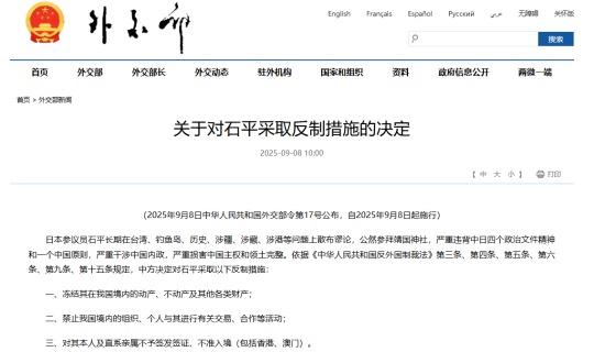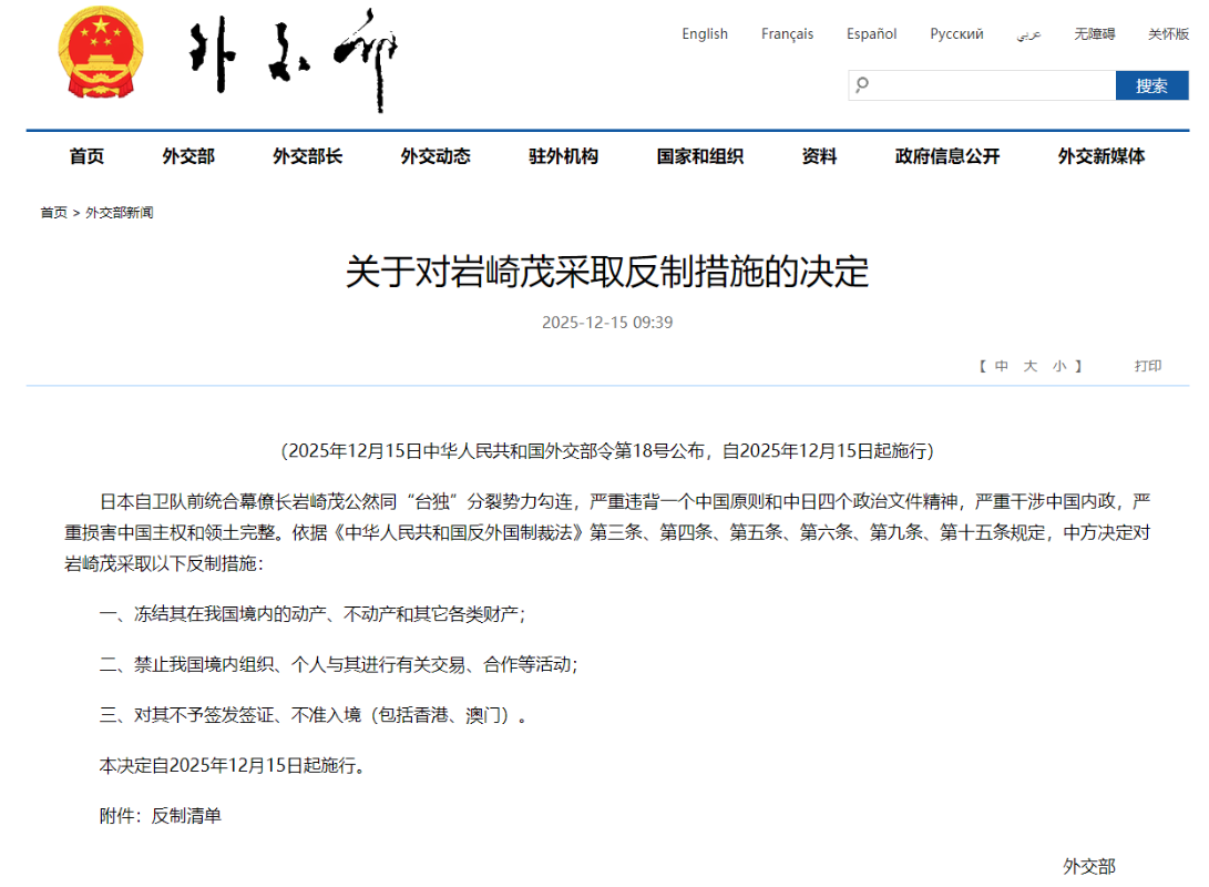 香港新聞網12月15日電 中國外交部12月15日發布對日本自衛隊前統合幕僚長岩崎茂採取反制措施的決定。 決定稱,岩崎茂公然同“台獨”分裂勢力勾連,嚴重違背一個中國原則和中日四個政治文件精神,嚴重干涉中國內政,嚴重損害中國主權和領土完整。依據《中華人民共和國反外國制裁法》第三條、第四條、第五條、第六條、第九條、第十五條規定,中方決定對岩崎茂採取以下反制措施: 一、凍結其在中國境內的動產、不動產和其它各類財產; 二、禁止中國境內組織、個人與其進行有關交易、合作等活動; 三、對其不予簽發籤證、不准入境(包括香港、澳門)。 本決定自2025年12月15日起施行。