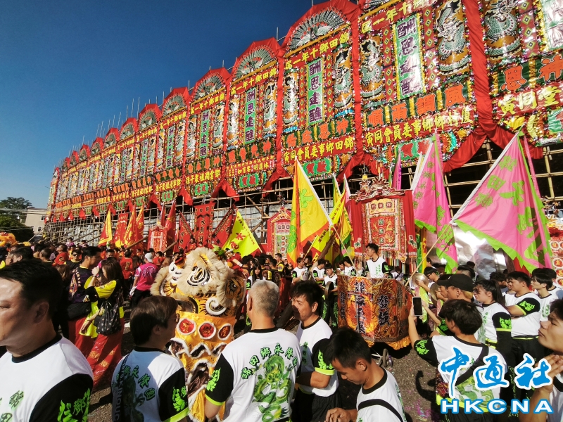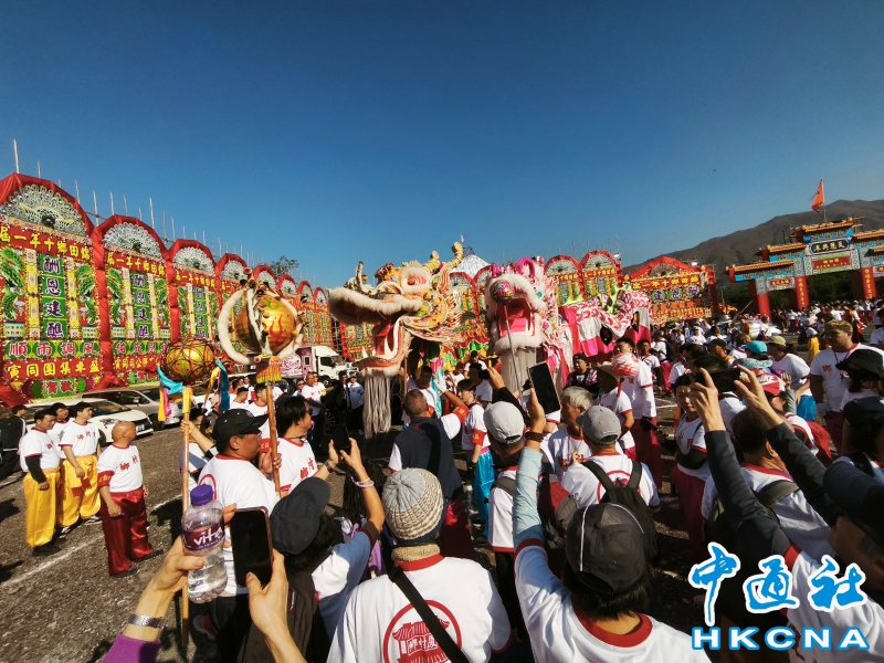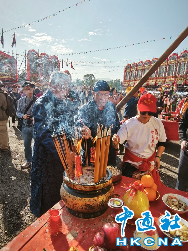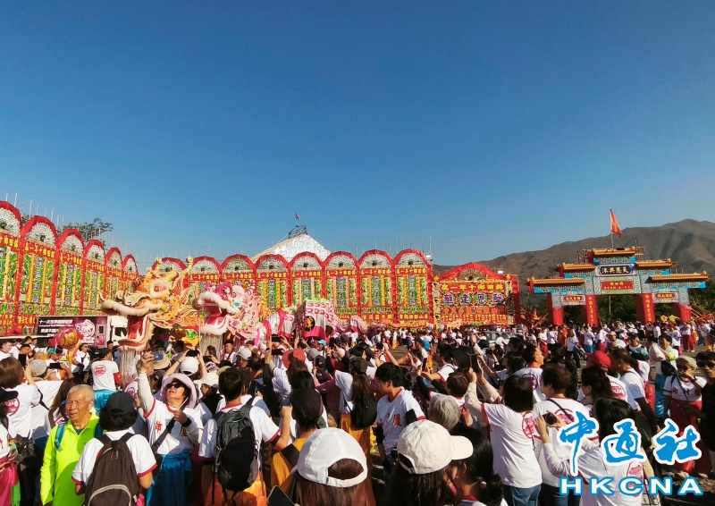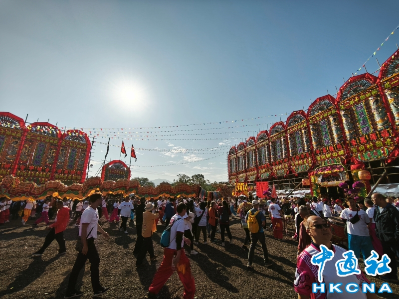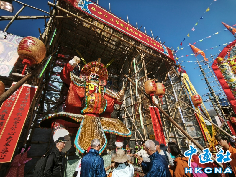 12月16日,香港元朗錦田鄉由12月 13 日起舉行每 10 年一度的傳統活動“錦田鄉酬恩建醮”,踏入第 34 屆,活動一連多日於水頭村周王二公書院前的醮場展開。2025年錦田鄉酬恩建醮踏入第34屆,錦田水頭村周王二公書院前搭建大型醮棚,在12月13日至19日舉行一系列傳統儀式和活動,如大士巡游、祈福儀式、粵劇大戲、龍獅表演、鄉鄰齋宴等等。 (香港中通社記者洪少葵攝) 香港中通社圖片