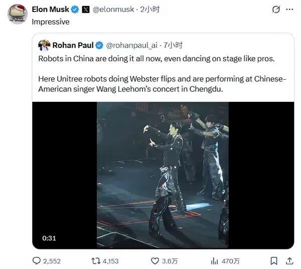 香港新聞網12月22日電 美國企業家、特斯拉CEO埃隆·馬斯克近日在社交平台轉發了一段機器人在演唱會上跳舞的視頻,並寫道:“Impressive”(令人印象深刻)。這則視頻中的人形機器人來自杭州“六小龍”之一、民營科企宇樹科技,演出場面則來自12月18日華人歌星王力宏在成都舉辦的演唱會。