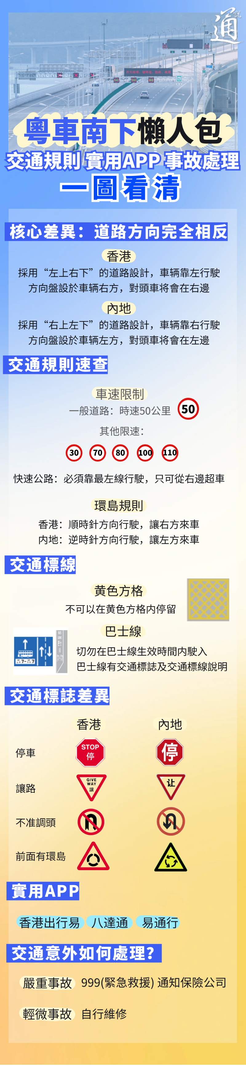 由於香港道路設計、駕駛規則與習慣與內地有顯著不同,於香港街頭駕駛左舵車的內地司機需做好充足準備。兩地交通規則差異、香港駕車出行實用APP、事故處理等自駕攻略一圖看清↓↓