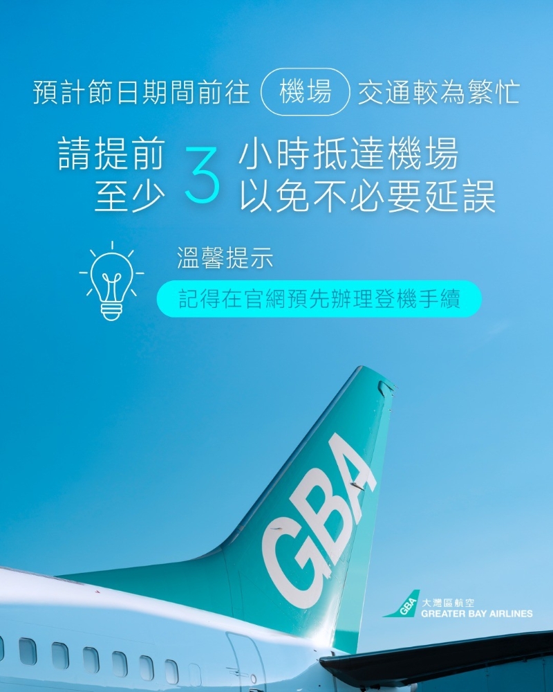 香港新聞網12月26日電 總部設於香港的的大灣區航空26日在社交媒體發佈,由於預計聖誕及新年期間前往機場的交通會較為繁忙,而辦理登機手續及進行安檢亦需要較長時間,建議旅客於航班起飛前最少3小時抵達機場,以避免不必要延誤。