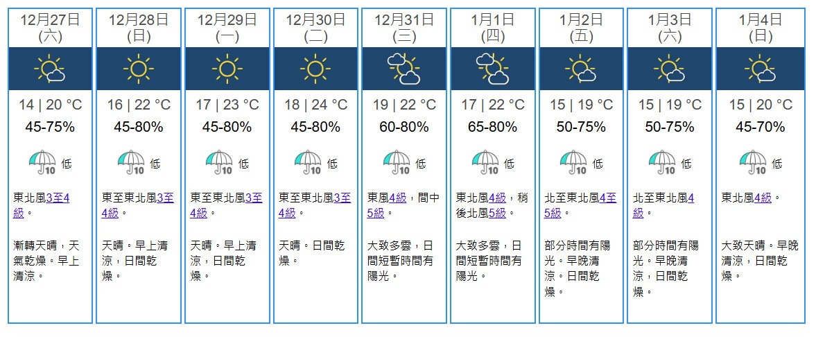 香港地區未來9天天氣預報。香港天文台網頁截圖 關於未來幾天天氣概況,香港天文台預報,乾燥的東北季候風會在未來兩三日為廣東沿岸帶來普遍晴朗的天氣,該區早上清涼,內陸地區日夜溫差頗大。預料一道雲帶會在下週中期影響華南沿岸,該區雲量較多,氣溫稍為回升。而一股季候風補充會在下週後期抵達華南,該區氣溫下降,早晚天氣清涼。(完) 【編輯:豐悅】