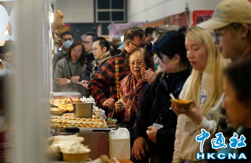 香港中通社12月27日電(記者 梁嘉軒 陳奕啟)香港冬日美食節等4個展覽聖誕期間在香港會展舉行,27日會場內依舊人頭湧湧,不少市民特地購票進場品嘗美食,更有市民提早辦年貨。
