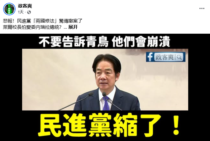 徐巧芯還透露,“聽說是被委內瑞拉嚇到。”國民黨前發言人楊智伃發文表示,是林宜瑾怕了?龜縮了?又或者是賴清德看見委內瑞拉總統馬杜羅的事,感到壓力了?臉書粉專“政客爽”也發文質疑,民進黨“兩國條例”驚傳撤案,“難道萊爾校長(賴清德)怕變成馬杜羅?”