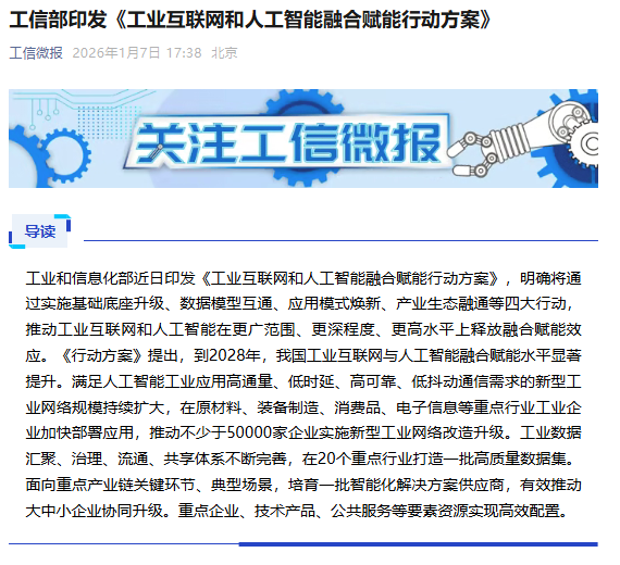 圖片來源:“工信微報”微信公眾號截圖 過去十年,中國製造業經歷了以工業互聯網為主軸的數字化轉型浪潮。如今,隨著通用大模型、邊緣智能、具身智能等新技術成熟,製造業正邁入“智能化”新階段。此次《實施意見》明確提出“到2027年,人工智能關鍵核心技術實現安全可靠供給,產業規模和賦能水平穩居世界前列”,不僅是技術目標,更是國家安全與產業競爭力的雙重訴求。 尤其值得注意的是,文件強調“推動3至5個通用大模型在製造業深度應用”、“打造100個工業高質量數據集”、“推廣500個典型應用場景”,這意味著政策不再停留於概念示範,而是聚焦可量化、可複製、可規模化的落地成果。從“試點”走向“普及”,從“單點突破”邁向“體系構建”,中國智造正在完成質的飛躍。 此外,《實施意見》對技術路徑的描繪極具前瞻性與實操性。一方面,強調底層硬科技突破——包括高端訓練芯片、端側推理芯片、智算雲操作系統、高速互聯等關鍵核心技術;另一方面,推動“模型輕量化”“大小模型協同”“行業大模型定制化”等軟件層創新,形成“硬軟協同、雲邊端一體”的完整生態。 特別值得關注的是對“工業智能體”的部署。文件提出打造編程開發智能體、推動智能體雲化、建立互聯互通協議,並探索註冊認證與分級管理機制。這不僅是技術升級,更預示著未來工廠將由“人控機器”轉向“智能體自主協同”的新範式,為實現真正意義上的“無人化工廠”奠定基礎。 與《實施意見》同步出爐的《行動方案》,則聚焦“工業互聯網與人工智能融合”這一關鍵交叉點。文件提出,到2028年,推動不少於5萬家企業實施新型工業網絡改造,滿足AI應用對高通量、低時延、高可靠、低抖動通信的需求。 分析認為,此舉將解決長期困擾工業AI落地的“數據孤島”與“網絡瓶頸”問題。通過構建全國一體化算力網絡、推廣智算雲服務、部署邊緣一體機與智能網關,工業數據將實現“採得快、傳得穩、算得準、用得好”。更重要的是,方案明確在鋼鐵、航空、船舶、電子信息等重點行業編制融合應用指南,確保政策紅利精準滴灌至產業痛點。 文件提及的“全球影響力”“生態主導型企業”“中國方案”等關鍵詞,彰顯中國不僅要成為AI製造的應用大國,更要成為規則制定者與技術輸出者。打造1000家標杆企業、建成全球領先的開源開放生態、全面提升安全治理能力,這些目標背後,是一場關於未來產業主權的戰略競賽。(完) 【編輯:林曉惠】