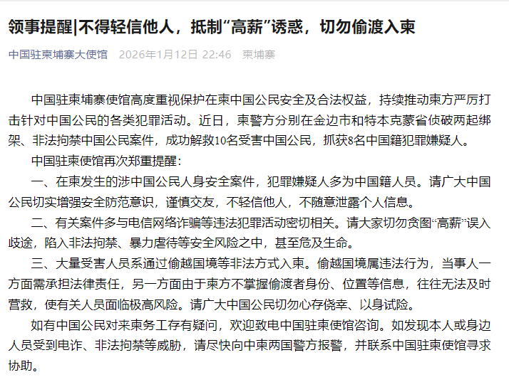圖源:“中國駐柬埔寨大使館”微信公眾號截圖 中國駐柬使館再次鄭重提醒:在柬發生的涉中國公民人身安全案件,犯罪嫌疑人多為中國籍人員。請廣大中國公民切實增強安全防範意識,謹慎交友,不輕信他人,不隨意洩露個人信息。有關案件多與電信網絡詐騙等違法犯罪活動密切相關。切勿貪圖“高薪”誤入歧途,陷入非法拘禁、暴力虐待等安全風險之中,甚至危及生命。大量受害人員係通過偷越國境等非法方式入柬。偷越國境屬違法行為,當事人一方面需承擔法律責任,另一方面由於柬方不掌握偷渡者身份、位置等信息,往往無法及時營救,使有關人員面臨極高風險。請廣大中國公民切勿心存僥幸、以身試險。 中使館表示,如有中國公民對來柬務工存有疑問,歡迎致電中國駐柬使館諮詢。如發現本人或身邊人員受到電詐、非法拘禁等威脅,請盡快向中柬兩國警方報警,並聯繫中國駐柬使館尋求協助。(完) 【編輯:彭玉婷】