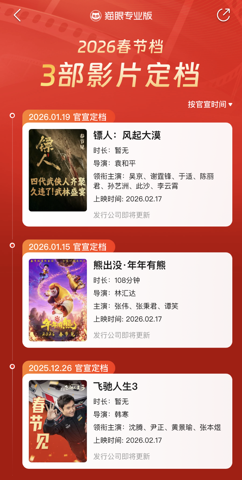 圖源:“貓眼專業版”APP截圖 綜合消息,已定檔三部影片各佔賽道:韓寒執導、沈騰主演的《飛馳人生3》延續賽車喜劇風格,貓眼“想看”人數超38萬,穩居熱度榜首;作為春節檔“釘子戶”,《熊出沒·年年有熊》第12次亮相,主打合家歡與非遺元素,鎖定親子市場;而19日壓哨定檔的《鏢人》則以吳京監製、袁和平執導,集結李連傑、謝霆鋒、惠英紅、于適及越劇演員陳麗君等“五代動作明星”,主打實景真打硬核武俠,試圖打破近年武俠片票房天花板,但其7億級(人民幣,下同)成本也帶來不小回本壓力。 據報,真正決定春節檔格局的,仍是尚未官宣的重磅項目。張藝謀新作《驚蟄無聲》最受矚目。該片為國安題材,由易烊千璽、朱一龍、宋佳、雷佳音、楊幂主演,融合量子竊密、AI算法等科技元素,業內預估票房潛力達25億元至50億元。但因題材嚴肅、審查敏感,片方仍在評估春節檔適配性。此外,賈玲新片《轉念花開》走現實女性路線,或有意避開紅海;成龍《熊貓計劃2》亦在候選名單中。 業界分析指出,今年片方普遍謹慎,既因2025年多檔期票房不及預期,也因春節檔長達9天,留有博弈空間。隨著《驚蟄無聲》等片有望本周官宣,春節檔“終極戰局”或將迅速明朗。(完) 【編輯:彭玉婷】
