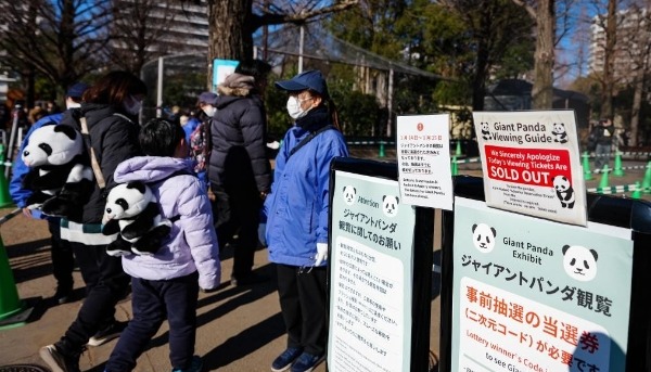 香港新聞網1月22日電 日本目前僅存的兩隻大熊貓“曉曉”和“蕾蕾”將於1月27日從成田機場搭飛機返回中國,這意味著日本將迎來50多年來的首次“零大熊貓”時代。1月25日將是它們最後一次亮相。近日,上野動物園的熊貓館前,都是提前通過官網預約到有限名額的民眾,排起蜿蜒百米的長龍,最少排隊一個小時以上,可以得到觀看一分鐘大熊貓的機會。