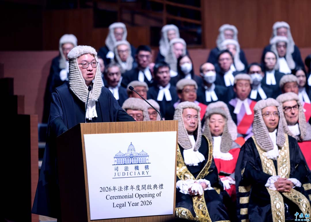 1月19日,香港2026年法律年度開啟典禮在香港大會堂舉行。香港特別行政區律政司司長林定國在香港大會堂發表演說。(香港中通社記者 鄧梓傑 攝)