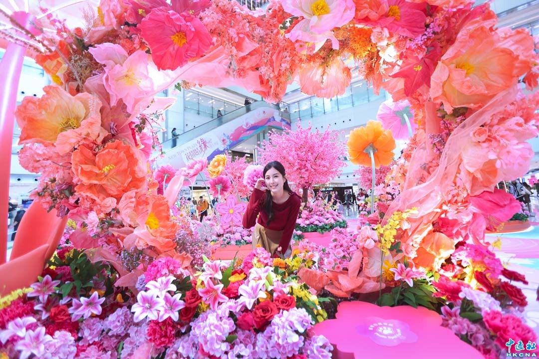 1月22日,香港沙田新城市廣場以“花開結緣·風生水起”為主題的新春裝飾亮相,打造五大沉浸式花藝打卡區,吸引市民駐足拍攝。現場以四時之花為靈感,佈置3.5米高巨型蘭花、心型百花拱門及360度全景飛花拍攝裝置,搭配祈緣風車與琉璃花球,營造浪漫節慶氛圍。圖為心型百花拱門裝置。(香港中通社記者 鄧梓傑 攝)