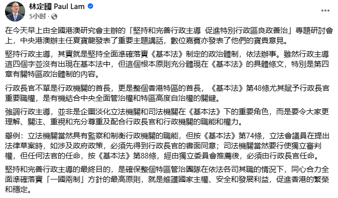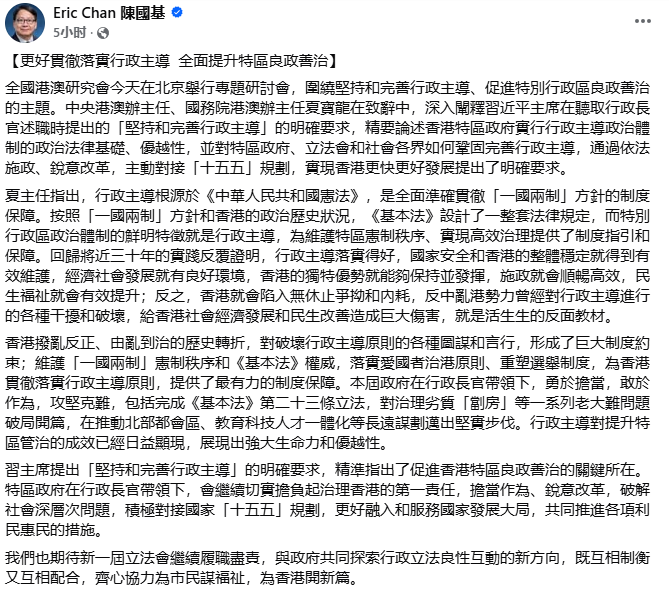 圖源:陳國基fb 香港特區政府政務司司長陳國基表示,應更好貫徹落實行政主導,全面提升特區良政善治。香港撥亂反正、由亂到治的歷史轉折,對破壞行政主導原則的各種圖謀和言行,形成了巨大制度約束;維護“一國兩制”憲制秩序和基本法權威,落實愛國者治港原則、重塑選舉制度,為香港貫徹落實行政主導原則,提供了最有力的制度保障。本屆政府在行政長官帶領下,勇於擔當,敢於作為,攻堅克難,包括完成基本法第二十三條立法,對治理劣質“劏房”等一系列老大難問題破局開篇,在推動北部都會區、教育科技人才一體化等長遠謀劃邁出堅實步伐。行政主導對提升特區管治的成效已經日益顯現,展現出強大生命力和優越性。