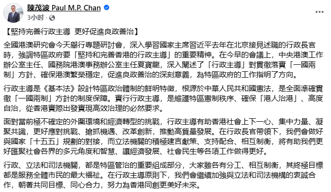 圖源:陳茂波fb 香港特區政府財政司司長陳茂波表示,應堅持完善行政主導,更好促進良政善治。行政主導是基本法設計特區政治體制的鮮明特徵,根源於中華人民共和國憲法,是全面準確貫徹“一國兩制”方針的制度保障。實行行政主導,是維護特區憲制秩序、確保“港人治港”、高度自治,從香港實際出發實現高效治理的必然要求。
