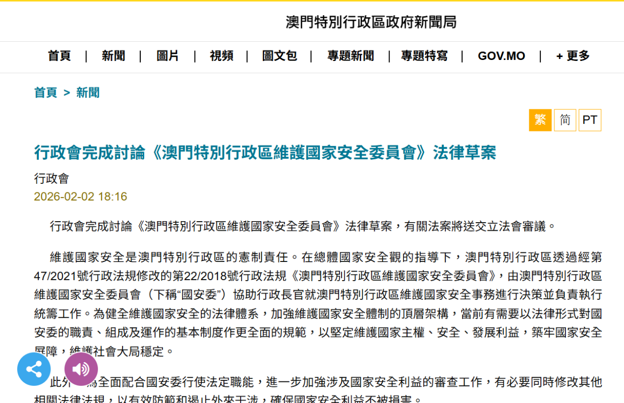 香港新聞網2月2日電 澳門特區行政會2日完成討論《澳門特別行政區維護國家安全委員會》法律草案,有關法案將送交立法會審議。
