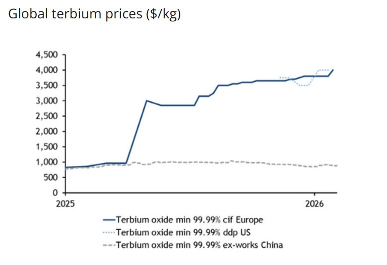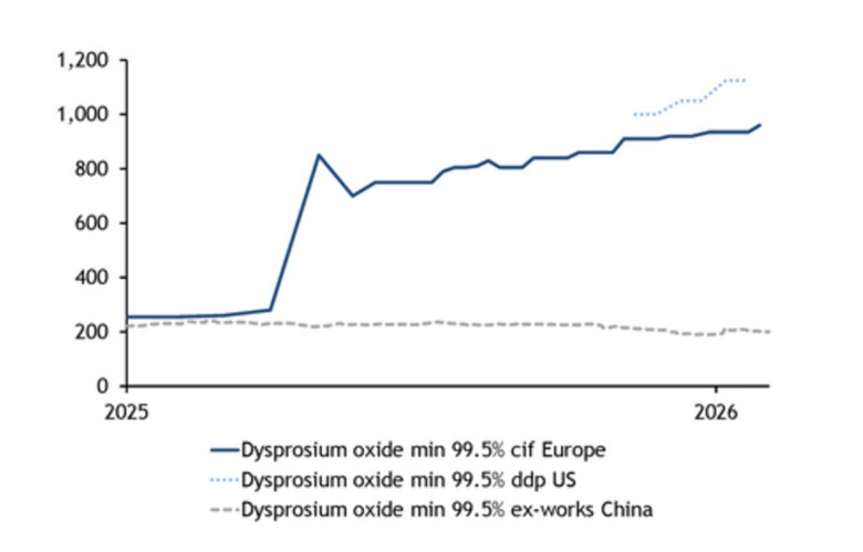 香港新聞網2月8日電 日前,國際能源及大宗商品價格評估機構阿格斯的媒體部門發佈數據顯示,在歐洲市場,鏑價已漲至每公斤960美元,鋱價為每公斤4000美元。據日本《日經亞洲》網站2月7日報道,這兩種稀土元素製成的磁體對電動汽車和混合動力汽車的驅動電機至關重要,其價格已連續兩周創下2015年有統計記錄以來的歷史最高值。