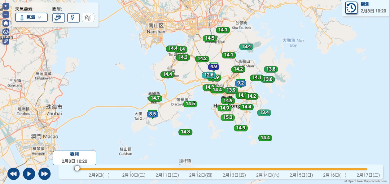 圖為2月8日早上10點氣溫監測情況,大帽山最低氣溫僅4.8℃。香港天文台截圖 香港天文台2月8日預報,乾燥的東北季候風正為廣東沿岸帶來清涼的天氣。而一道雲帶覆蓋該區。2月9日(周一)風勢頗大,早上相當清涼。隨後兩三日日間氣溫回升。