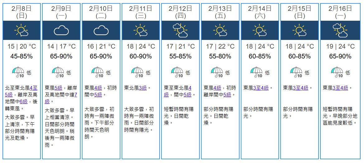 香港未來9天天氣預報。香港天文台截圖 香港地區今日(2月8日)天氣預測:大致多雲,下午部分時間有陽光及乾燥。吹和緩至清勁北至東北風,離岸及高地間中吹強風,稍後轉吹東風。(完) 【編輯:豐悅】