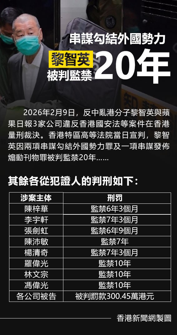 黎智英被判囚總刑期20年。其餘被告方面,陳梓華被判囚6年3個月;李宇軒被判囚7年3個月;張劍虹被判囚6年9個月;陳沛敏被判囚7年;馮偉光等3人被判囚10年;楊清奇被判囚7年3個月;《蘋果日報》3間有關公司分別被判罰款逾300萬港元。(完)