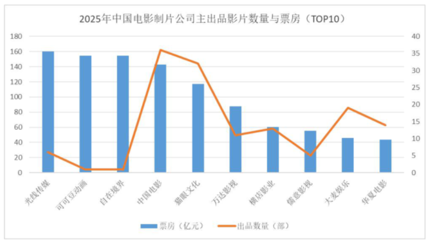 2025年中國電影製片公司主出品影片數量與票房(TOP10)。(圖源:中國電影藝術研究中心)