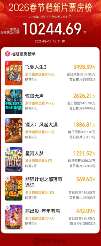 2026年春節檔電影突破1億元人民幣。(圖源:貓眼)