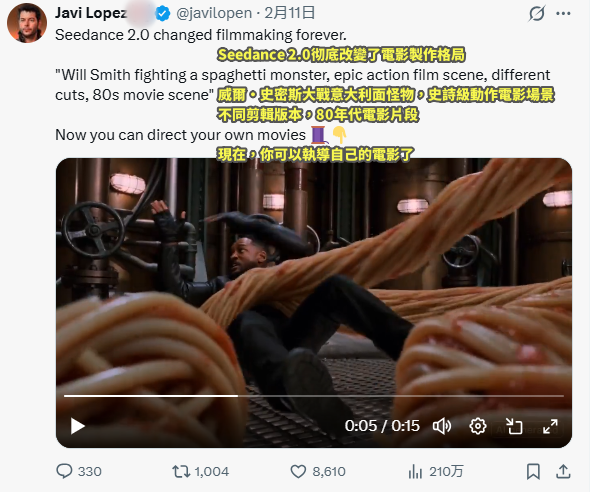 洛佩斯在X平台發布由Seedance 2.0生成的短視頻並配文:“Seedance 2.0徹底重塑了電影製作格局。威爾·史密斯大戰意大利麵怪物,史詩級動作電影場景……現在,你可以執導自己的電影了。”截至目前,該視頻瀏覽量已突破200萬大關。