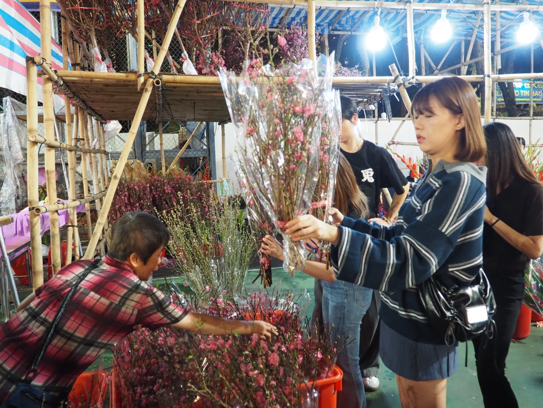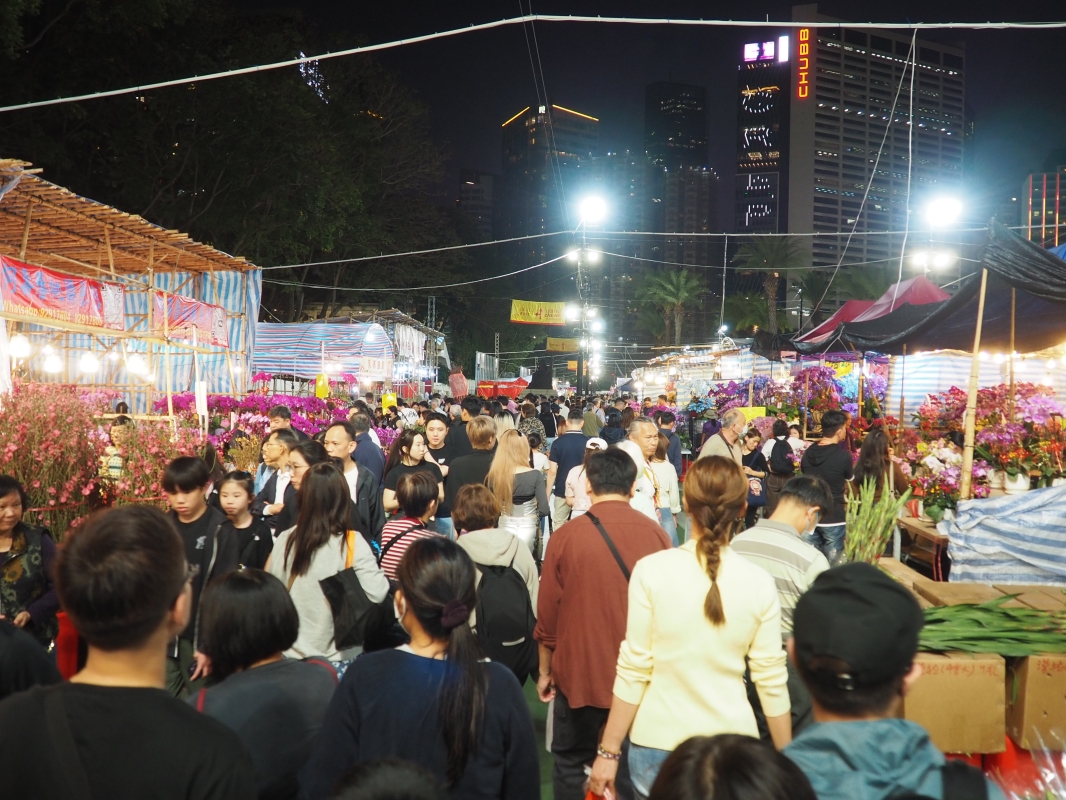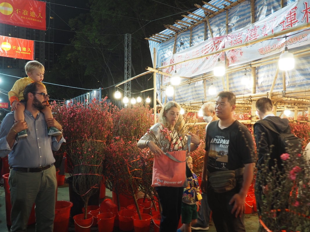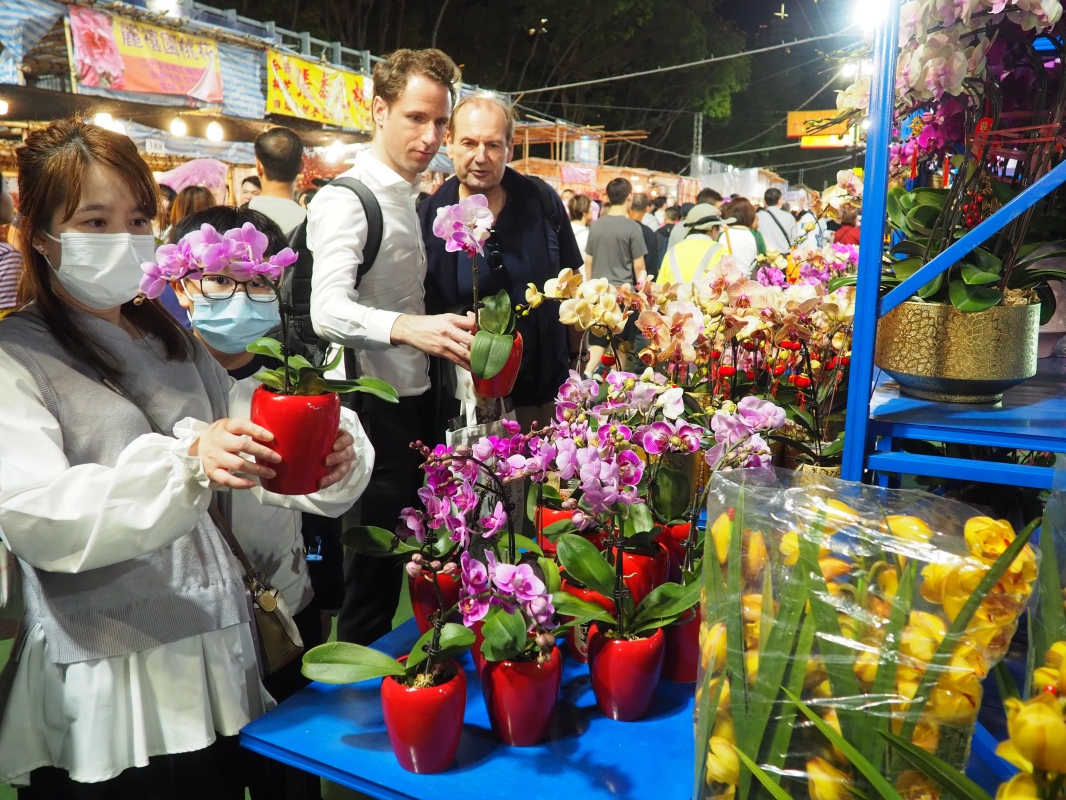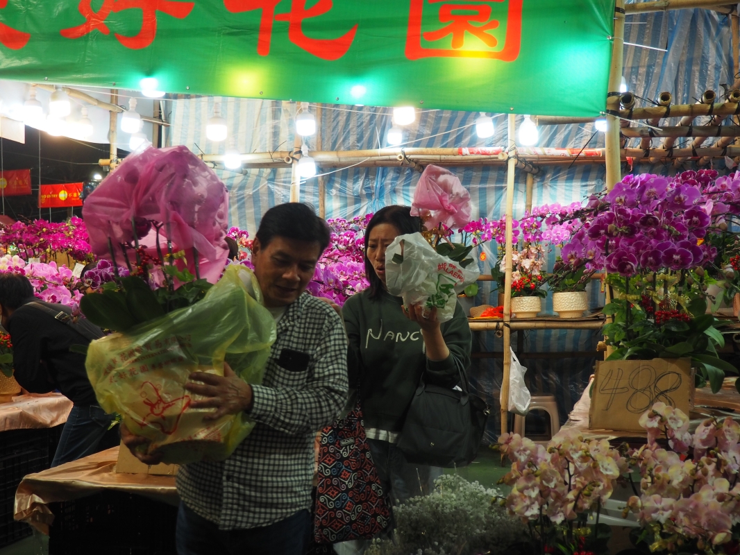 香港新聞網2月16日電(記者洪少葵)2月16日深夜,香港維園年宵市場人流逐漸增多,現場實施單向人流管制措施。不少市民在團年飯後到場買年花,也有的市民專門來熟食攤檔品嘗各種小食,包括冰糖葫蘆、羊肉串,魷魚。有賣年花的檔主打算以清貨價送花清貨。年宵花市吸引不少外國遊客到場感受中國傳統節慶氣氛。