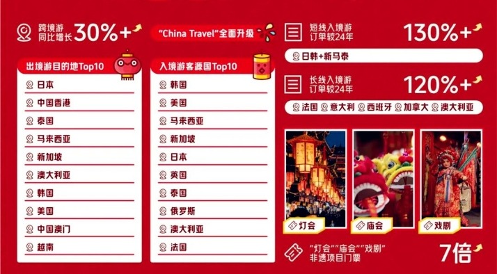 春節期間,遊人如鯽的香港尖沙咀星光大道。(記者 陳奕啟 攝) 從早前飛豬數據顯示,春節前夕出境遊服務預訂量同比增長近40%,而在出境遊預訂量前列的國家中,“8小時飛行圈”及更長線的國家占比已超六成。土耳其、新西蘭、俄羅斯、澳大利亞、越南等國家增長最快,普遍有1倍以上增速。 同程旅行方面表示,春節假期出境遊TOP10長線目的地中,土耳其以320%的熱度同比漲幅居於首位。在去哪兒平台上,春節期間中國遊客預訂了全球3000餘個城市的酒店,新晉免簽國土耳其酒店預訂量同比猛漲2.3倍,此外,烏茲別克斯坦、卡塔爾、埃及、西班牙、意大利、葡萄牙等國家的酒店預訂增速同比均超過1倍。 港澳以便捷交通及特色活動吸引遊客 攜程統計顯示,春節出境旅行熱門國家為泰國、澳大利亞、馬來西亞、新加坡、韓國、越南、西班牙、新西蘭、美國、印度尼西亞。而同程旅行數據顯示,春節節中出境遊熱門目的地(含地區)TOP10包括曼谷、吉隆坡、首爾、新加坡、中國香港、巴厘島、悉尼、胡志明市、中國澳門、普吉島。 港澳地區憑藉“一簽多行”政策和豐富活動,成為內地遊客熱門目的地。香港入境處數據顯示,年初一至初三,共錄得63.4萬人次訪港旅客入境,較去年同期三日的57萬人次,升11%。 當中年初三錄得逾23.9萬人次,包括21萬內地旅客,較去年同日升13%。澳門特區政府推出“一簽多行”便利措施,遊客可多次往返澳門與橫琴,帶動“澳門+橫琴”深度游熱潮。春節期間,澳門酒店入住率超90%,部分熱門酒店需提前3個月預訂。 為提升遊客體驗,港澳加強交通接駁。例如,香港西九龍站至廣州南站的高鐵班次增至每日110班,不到一小時即達廣州;澳門輕軌橫琴線開通,遊客可直達橫琴口岸。此外,兩地推出“非遺+美食”主題游,如香港“打鐵花”非遺表演、澳門“葡撻製作體驗”,吸引大量家庭遊客。 值得注意的是,從出境遊目的地排名數據中可以看到,日本跌出了TOP10。公開資料顯示,2024年訪日外國遊客消費額達到8.1395萬億日元(約合人民幣3794億元),中國大陸遊客的消費額以1.73萬億日元,位居各國之首,占到了總消費的21.3%。(完) 【編輯:錢林霞】
