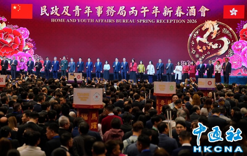 2月23日,香港特區政府民政及青年事務局在香港會議展覽中心大會堂舉行丙午年新春酒會。(香港中通社圖片) 當日下午四時,團拜現場已是張燈結彩、暖意融融。會場有數個“駿馬奔騰”主題裝飾,以及大埔區、黃大仙區、觀塘區等不同區域的裝置。 隨著舞龍醒獅開路,李家超伉儷攜手步入會場,不時向在場嘉賓揮手致意,笑容親切。 喧天的鑼鼓聲透牆而出,一場氣勢磅礴的開場表演,瞬間將喜慶氣氛推向高潮。24位年輕鼓手演繹由《歌唱祖國》、《男兒當自強》等改編的組曲,激昂的敲擊樂展現年輕一代團結一致、積極向上的精神風貌,寓意為香港新的一年開啟全新篇章。 全場奏唱國歌後,麥美娟局長致辭指出,過去一年,民政及青年事務局把“時時放心不下”的責任感,轉化為“事事心中有底”的行動力。新的一年,民青局將更加努力回應市民期盼,堅守“民政幫到你”的承諾,增強社會韌性,續寫香港長期繁榮穩定的新篇章。 隨後,李家超主持祝酒儀式,“祝願國家民富業茂、國運永昌;祝願香港特區和諧安定,欣欣向榮;祝願香港市民事事如意、歲歲平安。” 現場嘉賓一同舉杯,共賀新禧。 當日,香港中聯辦主任周霽,中央駐港國安公署副署長陳楓,外交部駐港公署副特派員張長偉,解放軍駐港部隊政治工作部副主任趙春森;以及香港特區政府官員等一眾嘉賓出席。(完) 【編輯:李冉】