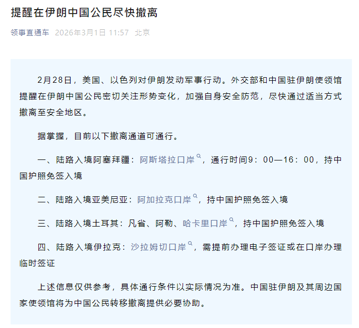 截圖自“領事直通車”微信公眾號 據掌握,目前以下撤離通道可通行。 一、陸路入境阿塞拜疆:阿斯塔拉口岸,通行時間9:00—16:00,持中國護照免簽入境 二、陸路入境亞美尼亞:阿加拉克口岸,持中國護照免簽入境 三、陸路入境土耳其:凡省、阿勒、哈卡里口岸,持中國護照免簽入境 四、陸路入境伊拉克:沙拉姆切口岸,需提前辦理電子簽證或在口岸辦理臨時簽證 上述信息僅供參考,具體通行條件以實際情況為准。中國駐伊朗及其周邊國家使領館將為中國公民轉移撤離提供必要協助。 聯繫方式 外交部全球領事保護與服務應急熱線(24小時): +86-10-12308 +86-10-65612308 駐伊朗使館領事保護與協助電話: +98-9122176035 駐阿巴斯總領館領事保護與協助電話: +98-9914240393 駐阿塞拜疆使館領事保護與協助電話: +994-502624468 駐亞美尼亞使館領事保護與協助電話: +374-99308908 駐土耳其使館領事保護與協助電話: +90-5388215530 駐伊斯坦布爾總領館領事保護與協助電話: +90-5313389459 駐伊拉克使館領事保護與協助電話: +964-7901912315 駐巴士拉總領館領事保護與協助電話: +964-7858618940 (完) 【編輯:劉春】
